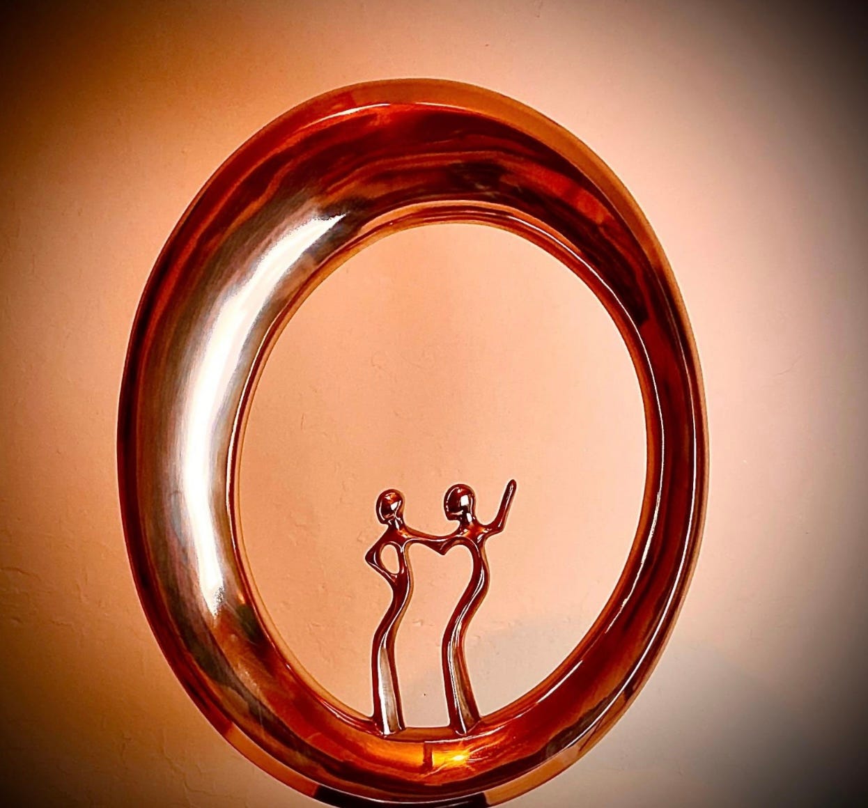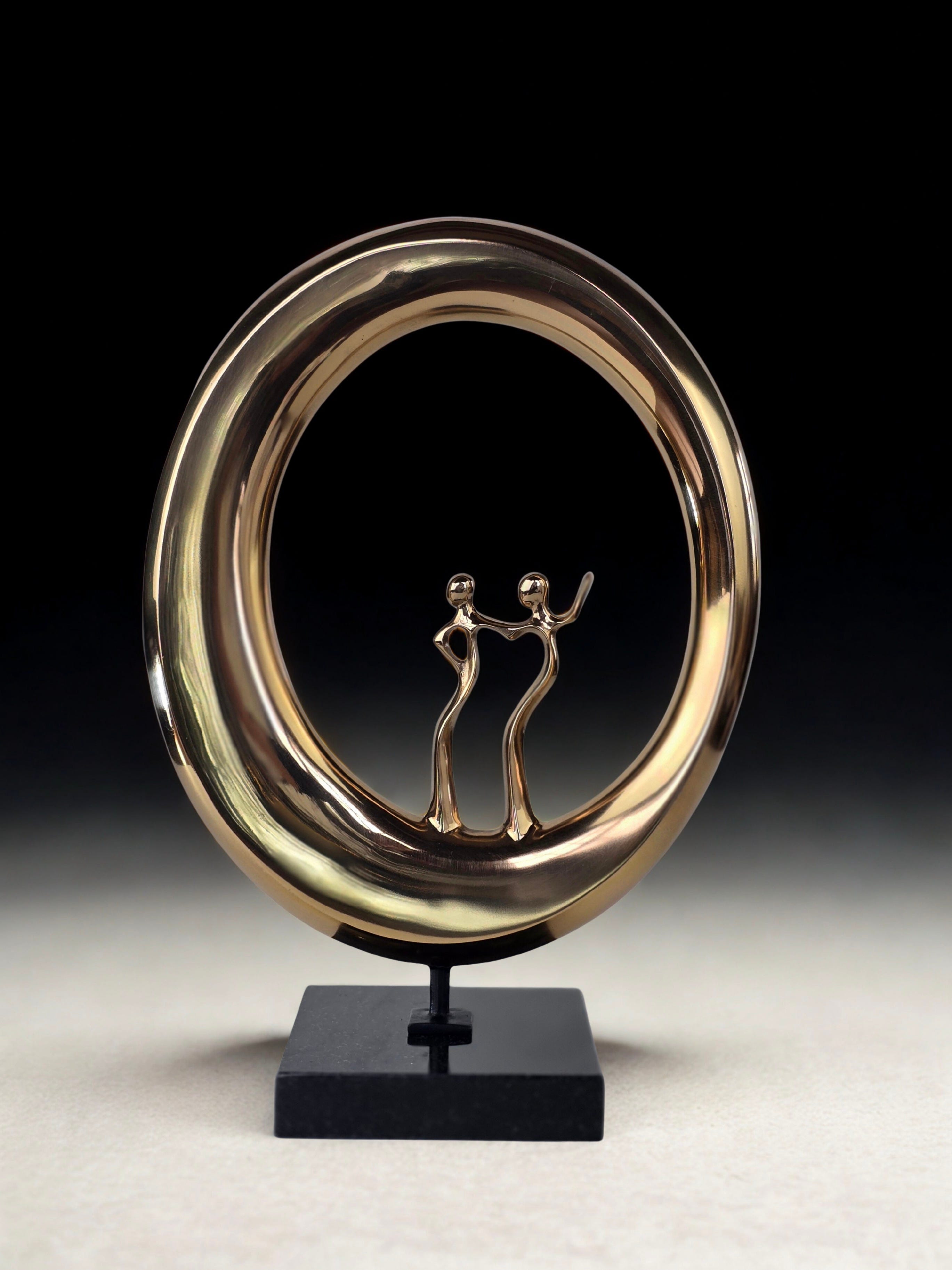 Two figures stand together, enclosed by a continuous, unbroken form. The circle is not a frame; it is time itself. There is no beginning visible, and no end. This is intentional.